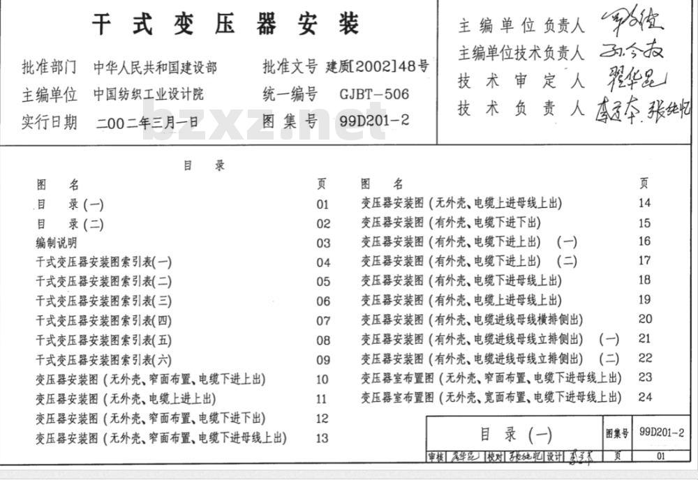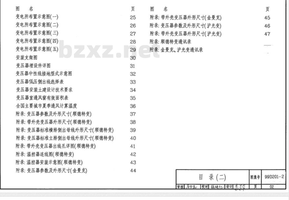 5.变压器中性线接地型式示意图6.变压器安装土建设计要求及理设件图7.附录提供设计者使用参考的一些厂家变压器资料六本图集仅解决变压器的布置及安装,图集中索引表所示的主接线仅为了帮助设计者选用安装图页号.主接线、PE线及中性线的选定、线路数设方式、敷设路径及室内标高由工程设计确定七本图集按下述变压器容量编制变压器的进出线方式1.30~1250kVA采用高压电缆进线低压电缆出线方式2.250~2500kVA采用高压电缆进线低压母线出线方式八本图集”变压器安装图索引表”有中压隔离开关、中压负荷开关、中压断路器、避雷器及配置上述器件的相应环网柜、中压配电柜方案供设计者参考