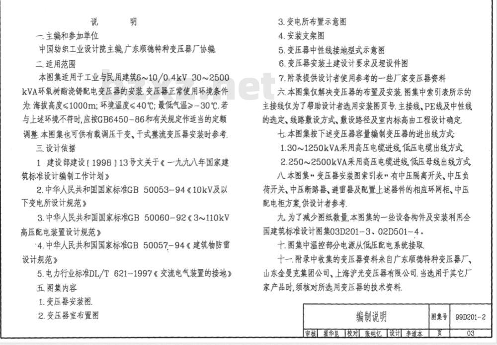 本图集适用于工业与民用建筑6~10/0.4kV30~2500KVA环氧树酯浇铸配电变压器的安装变压器正常使用环境条件为:海拔高度≤1000m:环境温度≤40℃:最低气温≥-30℃.若与上述环境不符时,应按GB6450一86和有关规定作适当的定额调整本图集也可供有载调压干变、干式整流变压器安装时参考三.设计依据