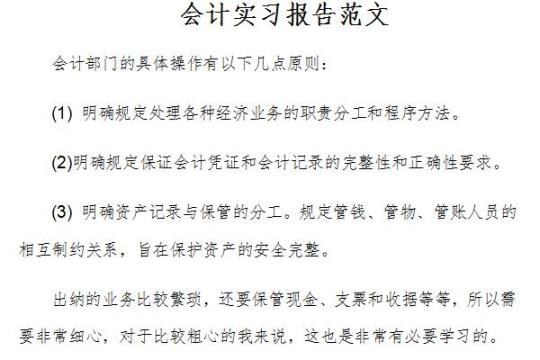 万能会计实习报告范文精选(一)实习是每一个大学毕业生必须拥有的一段经历,它使我们在实践中了解社会、在实践中巩固知识。实习又是对每一位大学毕业生专业知识的一种检验,它让我们学到了很多在课堂上根本就不到的知识,既开阔了视野,又增长了见识,也是我们走向工作岗位的第一步。
