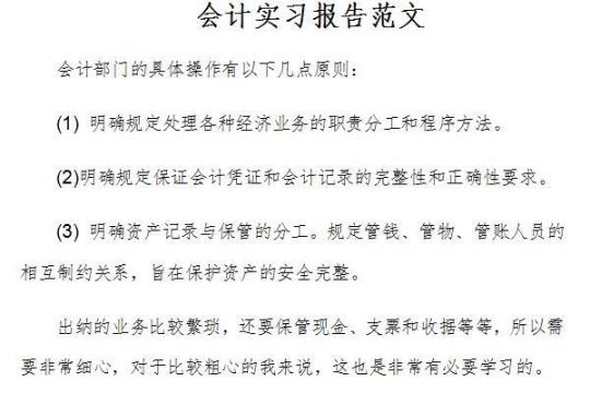 毕业前的几个月实习是每个大学毕业生所必须拥有的一段宝贵的经历,它使我们在实践工作中慢慢了解社会、在实践中进一步巩固知识;实习又是对每位大学毕业生专业知识的一种最好的检验,它让我们学到了很多在大学课堂上根本就不可能学到的知识,既开阔了我们视野,又增长了我们的见识,为我们以后进一步走向现实社会打下牢固的基础,这也是我们走向工作岗位的第一步。会计是什么?是对会计单位的经济业务从数和量两个方面进行计量、记录、计算、分析、检查、预测、参与决策、实行各方面监督,旨在提高企业经济效益的一种常规核算手段,它本身也是经济管理活动的一项重要组成部分。会计专业作为应用性非常强的一门专业学科、一项很重要的经济管理工作,是加强企业经济管理,提高企业经济效益的一种重要手段,经济管理总是离不开会计,经济发展越快,会计工作就会显得越重要。